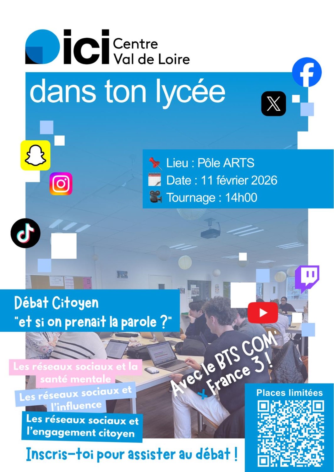 Il y a une vingtaine de places disponibles : pour assister à la clôture de ce projet mené avec FRANCE 3 (ICI Centre Val de Loire) et le CLEMI, il faut impérativement s'inscrire via le formulaire d'enquête https://lycees.netocentre.fr/forms/inscription-d%C3%A9bat-citoyen-au-lyc%C3%A9e-voltaire-1769673078 et être libéré de cours ou de travail. C'est l'occasion de voir la mise en place d'un plateau télé et l'aboutissement projet (Comment mettre en place un débat ?) mené par les apprentis communication entourés de journalistes professionnels et de leurs professeurs de communication.